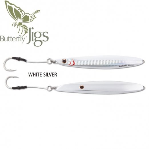 The 2016 Shimano Butterfly Flat-Side Jigs are available in six sizes/weights and eight awesome colors. There are even a few models with glow in the dark finishes. They come rigged. The 112g and 140g models have a 5/0 hook. The 160g and 224g models have a 7/0 hook. The 280g and 325g models have an 8/0 hook.